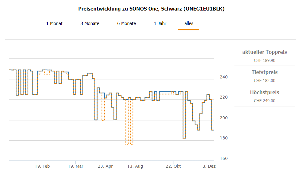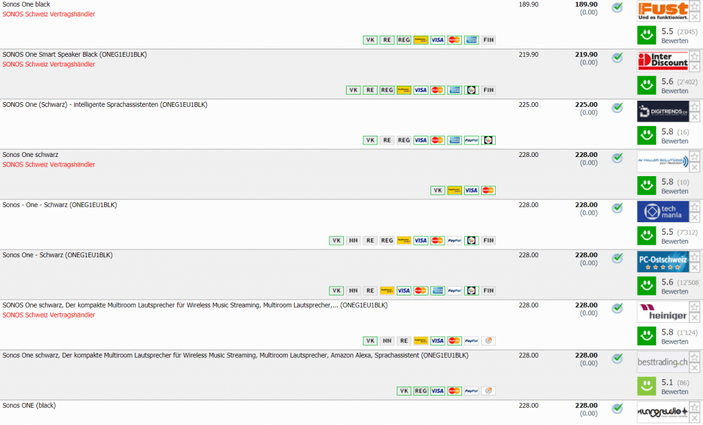 Bei Fust gibt’s gerade die Sonos One für CHF 189.90 Der zweitbeste Preis in der Schweiz beträgt CHF 219.90, Bestpreis lag laut toppreise bei CHF 176.-