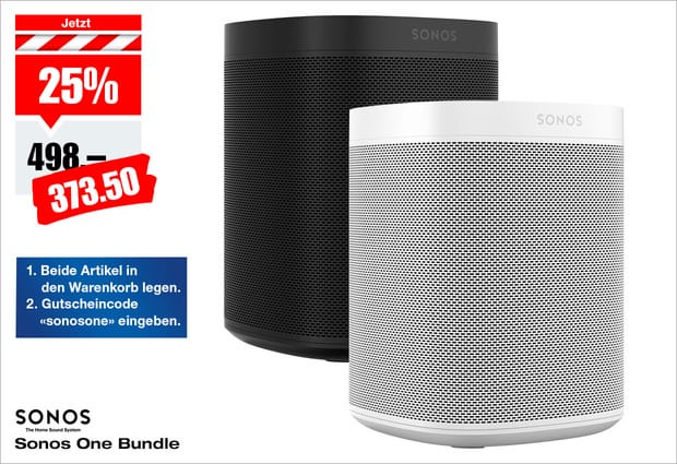 Einfach zwei Sonos One Lautsprecher in den Warenkorb legen und Gutscheincode „sonosone“ eingeben.