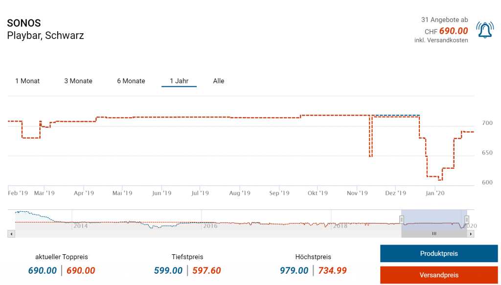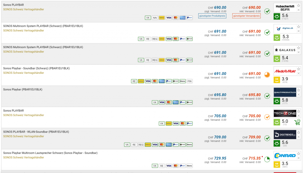 Bei Amazon.de gibt’s gerade die Sonos Playbar für umgerechnet CHF 587.- inklusive Versand und Verzollung. In der Schweiz werden ab CHF 690.- für die Playbar fällig. Bestpreis war bei CHF 599.-