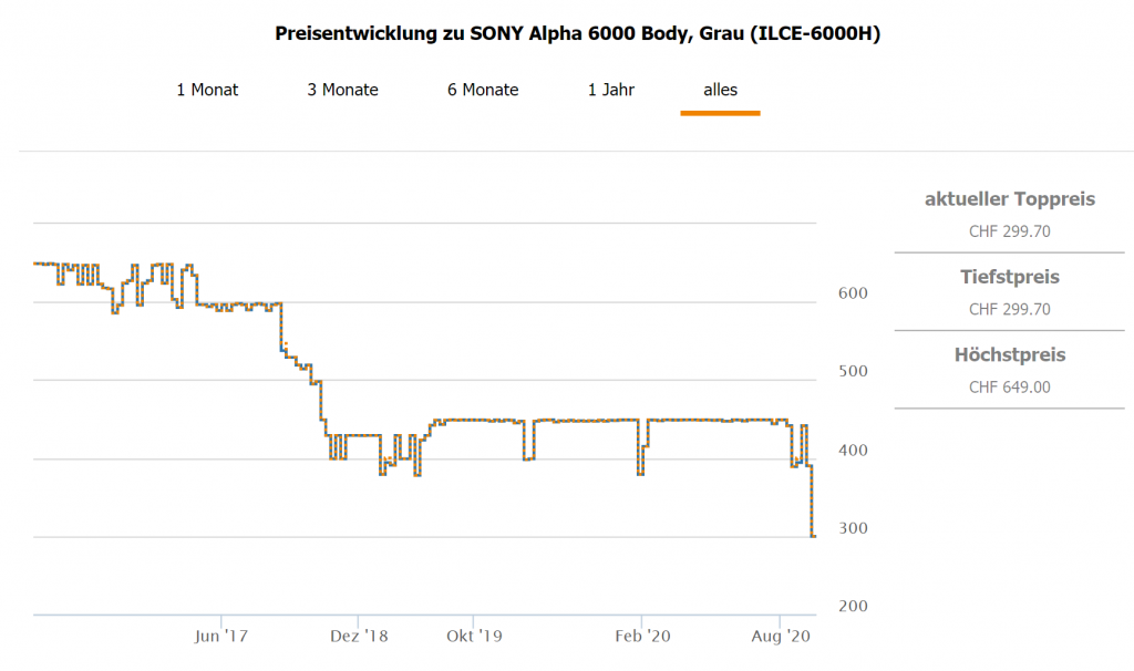 MediaMarkt verkauft gerade noch Restposten der SONY Alpha 6000 Body Systemkamera für CHF 299.70 Zweitbester Preis ist bei CHF 449.-