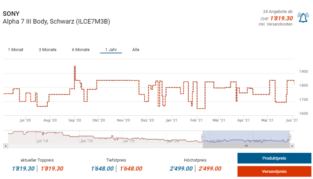 Bei Brack gibts derzeit die Systemkamera Sony Alpha 7 III als Body zum Aktionspreis von 1649 Franken. Laut toppreise starten die Preise sonst bei über 1819 Franken. Des Weiteren berechtigt der Kauf bei Brack zur Cashback-Promotion, wo es nochmals 200 Franken gibt.