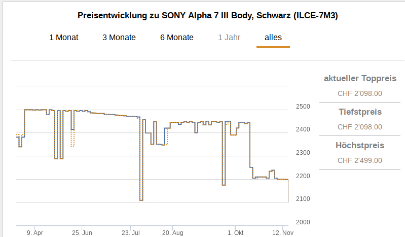 Bei melectronics gibt es die Sony Alpha A7 III (ILCE-7M3) aktuell für CHF 2098.- so günstig war sie bisher noch nie, lediglich das 1.-August-Angebot von interdiscount kam mit CHF 2107.- in die Nähe.
