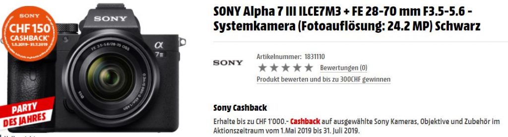 Bei Mediamarkt gibt’s gerade die SONY Kompakte Alpha a7 III Black inkl Obkjektiv 28-70mm zum Bestpreis von CHF 1999.-.
