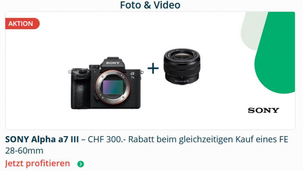 Aktuell erhält man bei Microspot die Alpha 7 III für CHF 1699.-, wenn man allerdings das Objektiv FE28-60 (CHF 434.-) mit in den Warenkorb tut reduziert sich der Preis der Kamera um CHF 300.- und somit besser als Black Friday!