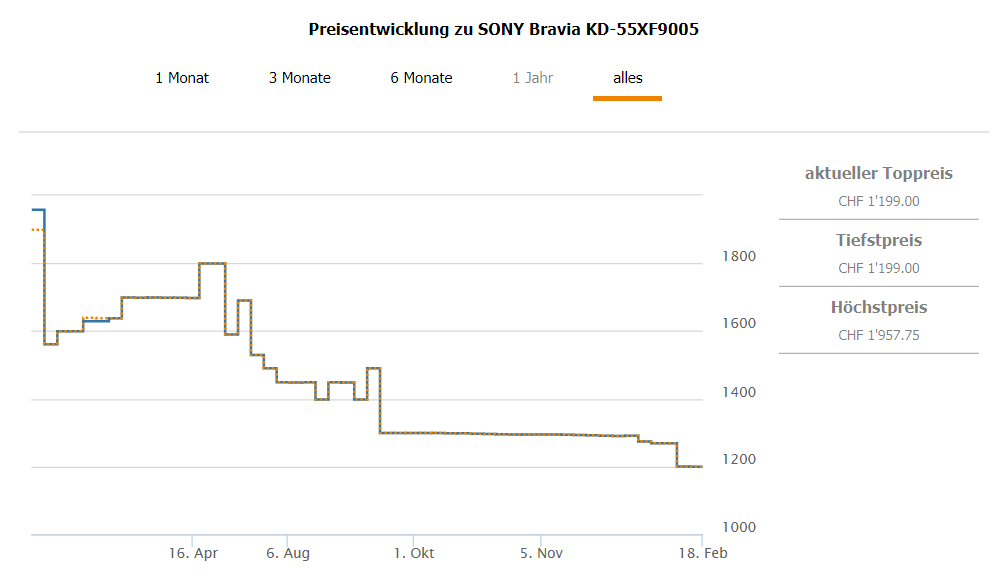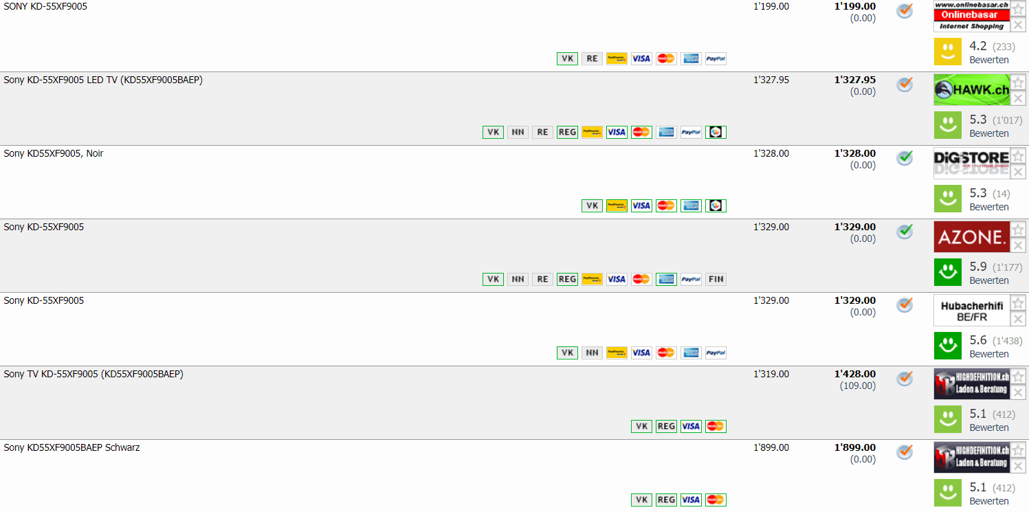 Bei MediaMarkt gibt’s diese Woche den 55“ TV SONY Bravia KD-55XF9005 für CHF 999.- Bestpreis und zweitbester Preis liegen laut toppreise bei CHF 1’199.- Bei Google Shopping habe ich den TV aber auch für CHF 1’099.- gesehen, womit ich nicht genau sagen kann, ob der Bestpreis wirklich stimmt.