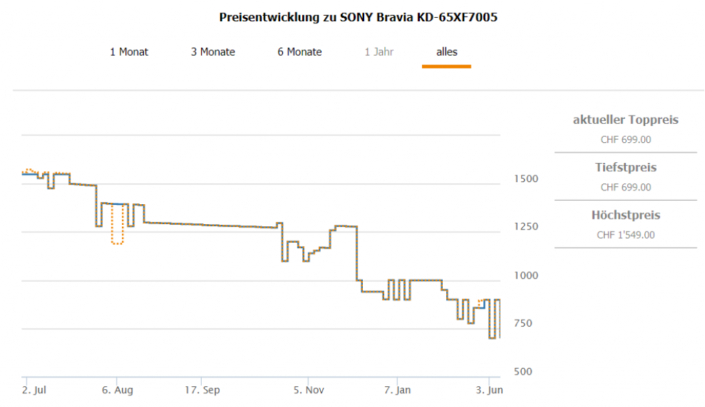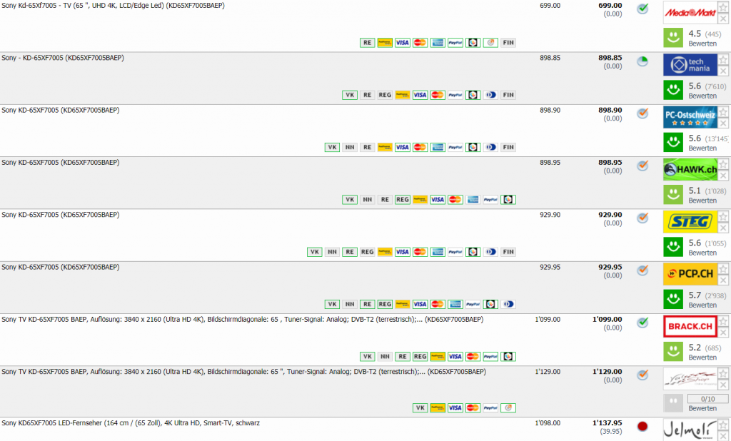 Bei MediaMarkt erhält man gerade den SONY Bravia KD-65XF7005 für CHF 699.- Den Preis gab es vor ein paar Tagen offenbar schon einmal, aber es ist niemandem aufgefallen. Ansonsten lag der Bestpreis bei CHF 777.- Zweitbester Preis derzeit beträgt CHF 898.85