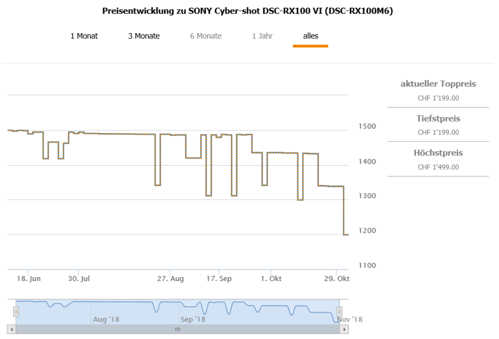 Bei microspot gibt es aktuell die SONY Cyber-shot DSC-RX100 VI für 1199.- CHF.
