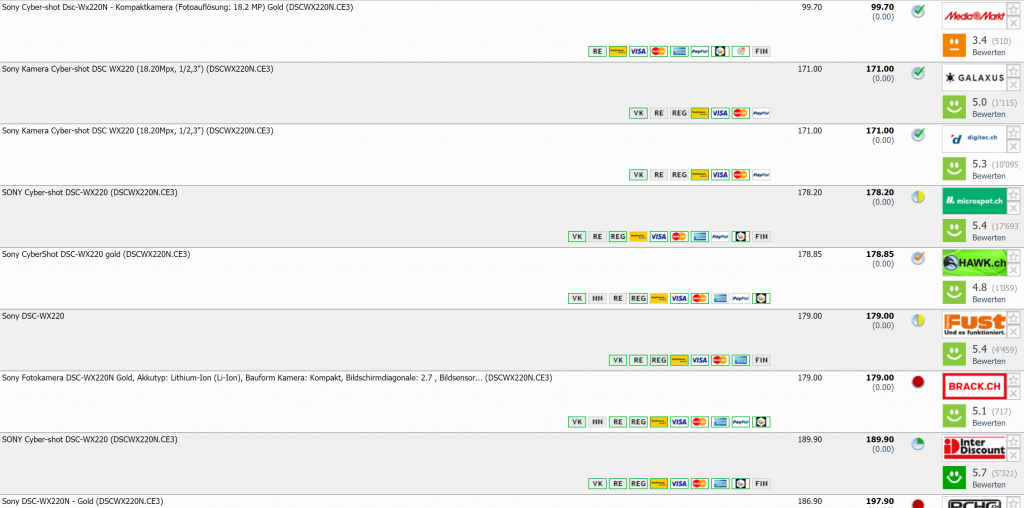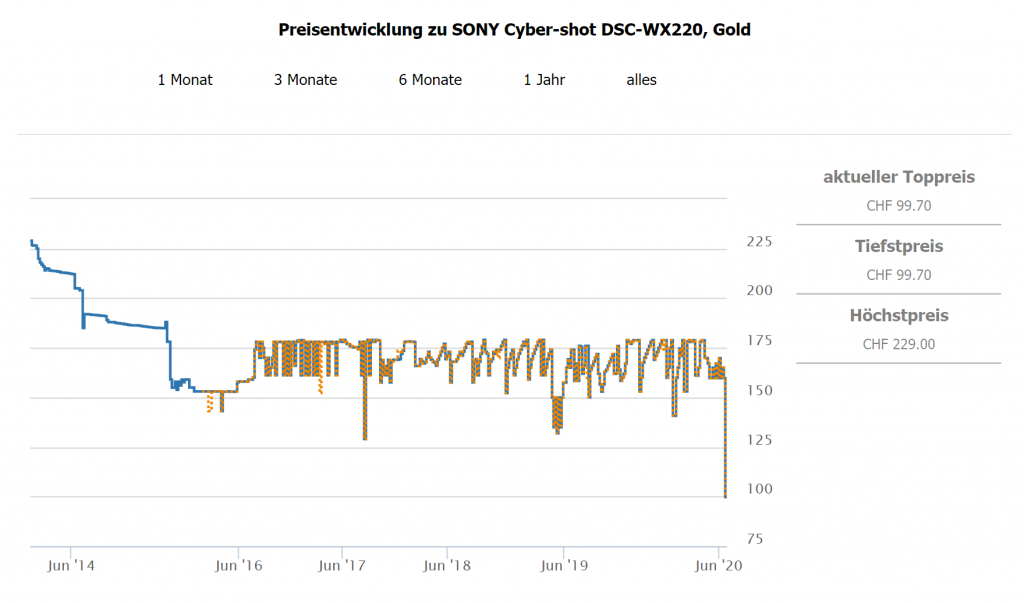 Bei MediaMarkt gibt’s gerade die SONY Cyber-shot DSC-WX220, Gold für CHF 99.70 Es sind nur noch wenige Stück verfügbar.