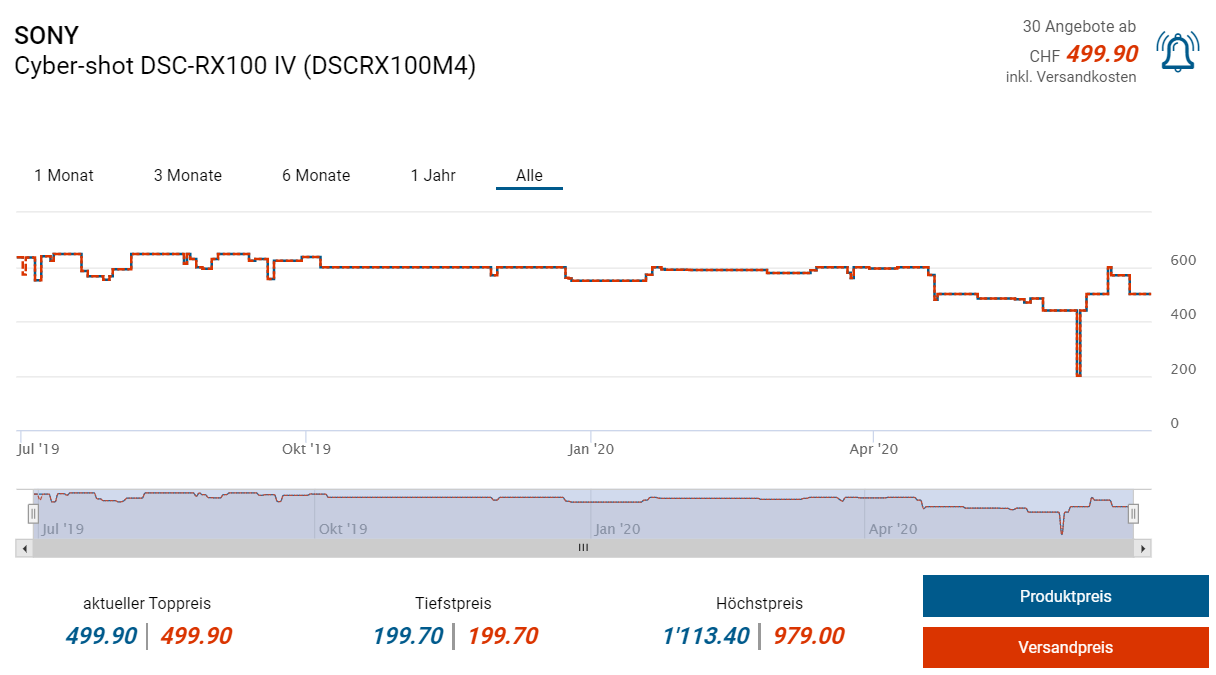 Bei digitec gibts heute im Tagesangebot-Sale die Kompaktkamera DSC RX 100 Mark 4 zum Aktionspreis von 347 Franken, laut toppreise beträgt der Vergleichspreis für versandte Ware 499 Franken, man kann die Kamera aber in (wenigen) melectronics-Filialen für 347.50 Franken abholen.