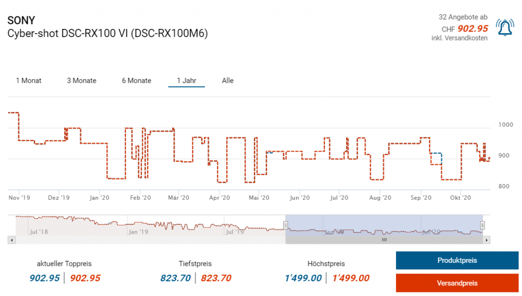 Bei Amazon Frankreich gibts derzeit die Premium-Kompaktkamera DSC RX VI (M6) zum Aktionspreis von 770 Franken. Laut toppreise starten die Preise in der Schweiz ab CHF 902.25, der Bestpreis soll bisher bei CHF 823.70 gelegen haben.