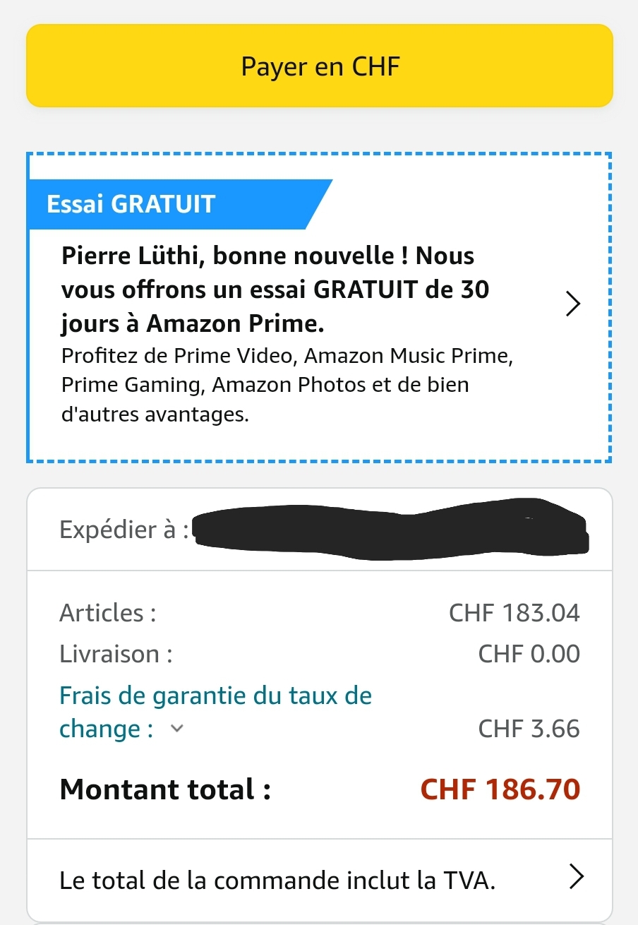 - Für Lieferungen in die Schweiz wird der Preis erst bei Angabe einer Schweizer Lieferadresse richtig angezeigt (Abzug der Mehrwertsteuer, zuzüglich Versandkosten) resp. beim Checkout an der Kasse (Amazon Frankreich, Italien, Spanien und Grossbritannien). Wir verwenden grundsätzlich den Interbanken-Kurs für die Umrechnung in CHF.