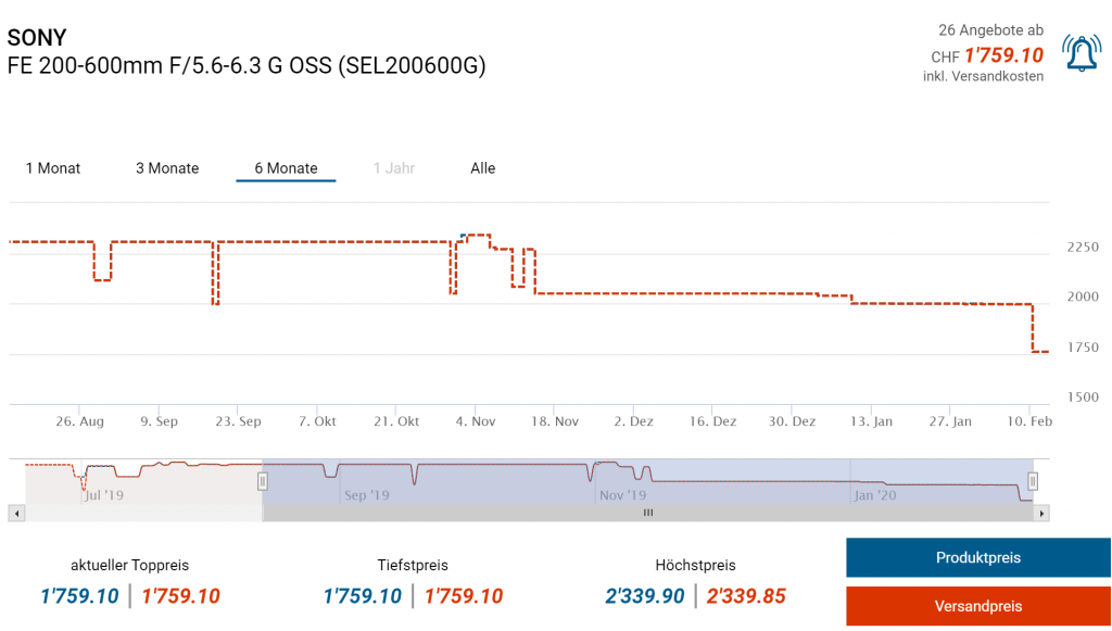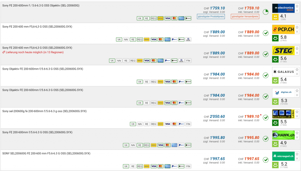 Bei melectronics gibt’s das Super-Telezoom-Objektiv für Naturaufnahmen Sony FE 200-600mm f / 5.6-6.3 G OSS gerade für CHF 1759.10 Wenn man sich zum Newsletter anmeldet, erhält man einen 10.- Rabattcode, der sich kombinieren lässt und bezahlt so nur noch CHF 1749.10. Bestpreis bisher scheint bei CHF 1998.75 gewesen zu sein, derzeit zweitbester Preis beträgt CHF 1889.-