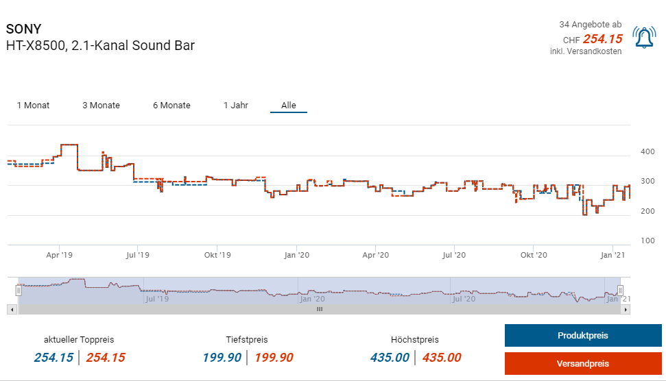 Bei Mediamarkt gibts derzeit die Soundbar HT-X8500 von Sony zum Aktionspreis von knapp 254 Franken. Laut toppreise soll der Vergleichspreis derzeit bei 294 Franken liegen, allerdings gabs die Soundbar am Black Friday bereits für etwa 200 Franken.