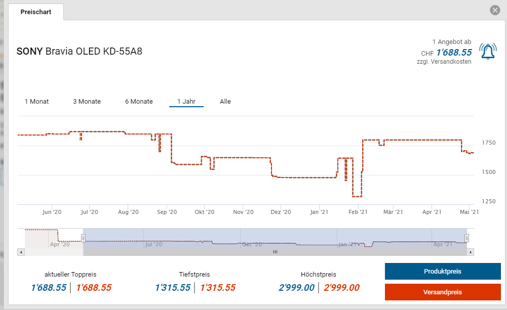 Bei Fust gibt es den Sony KD-55A87 4K Fernseher für den neuen Bestpreis von CHF 1111.-. Der vorherige Bestpreis war CHF 1315.55. Der zweitbeste Preis beträgt CHF 1688.55.