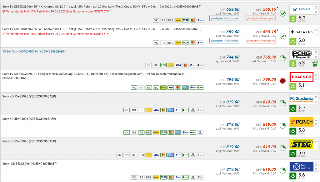 Bei MediaMarkt gibt’s den SONY KD-55XG8096 55“ TV gerade für CHF 499.- Bestpreis laut toppreise war bei CHF 551.70 Zweitbester Preis im Moment beträgt CHF 560.-