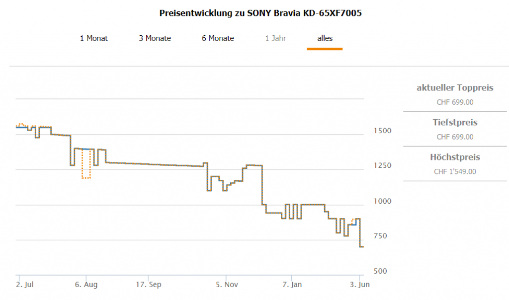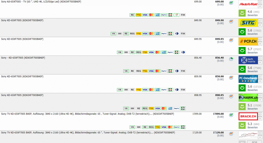 Bei MediaMarkt gibt’s den SONY KD-65XF7005 65“ 4K TV für CHF 699.- Zweitbester Preis in der Schweiz ist bei CHF 849.90 Bestpreis war bei CHF 777.-