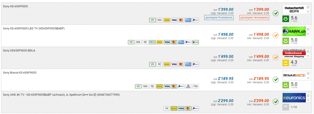 Bei Interdiscount gibt’s gerade den SONY KD-65XF9005 für CHF 999.- Zweitbester Preis laut toppreise beträgt CHF 1399.- Bestpreis war bei CHF 1299.-