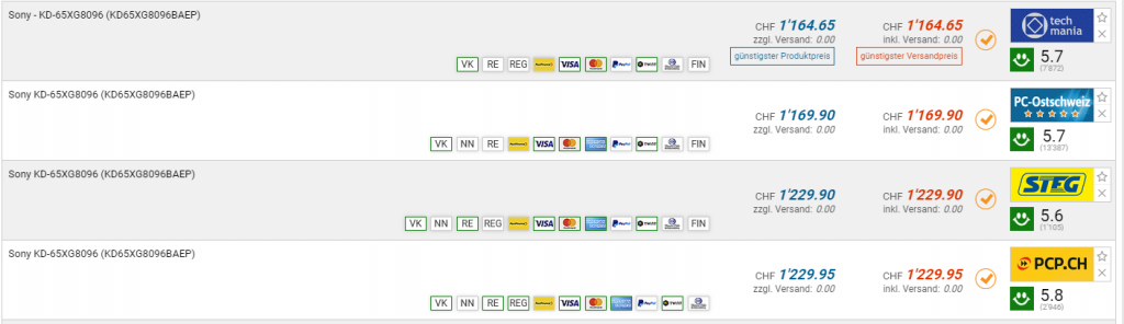 Bei DayDeal bekommt man den Sony KD-65XG8096 Fernseher für den neuen Bestpreis von CHF 899.-. Der vorherige Bestpreis war CHF 1073.15. Der zweitbeste Preis beträgt CHF 1165.65.