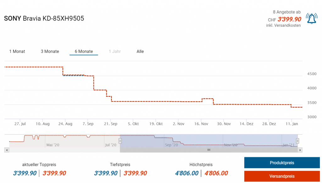 Bei MediaMarkt gibt’s gerade den 85 Zöller SONY KD-85XH9505 für CHF 2996.- Zudem erhält man nur heute noch einen Gutschein in Höhe von CHF 250.- obendrauf. Zweitbester Preis: CHF 3399.90