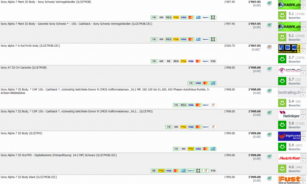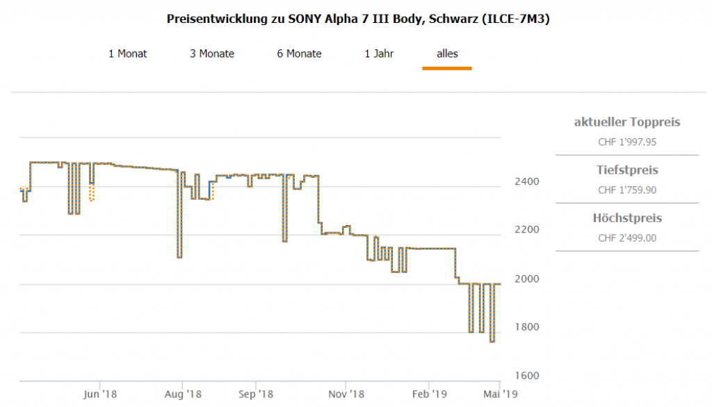 Bei Interdiscount gibt’s gerade die SONY Kompakte Alpha a7 III Body Black für CHF 1847.90. Gleichzeitig läuft eine Cashback Aktion, mit welcher man 150 Franken zurückerhält. Total bezahlt man also knapp CHF 1700.- Zweitbester Preis im Moment beträgt CHF 1’997.95, Bestpreis war bei CHF 1759.90