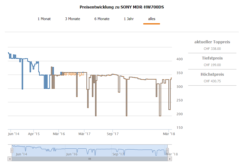 Momentan liegt der zweitbeste Preis in der Schweiz bei CHF 338.- Den Sony MDR-HW700DS gab’s aber bereits mehrmals zum Preis von CHF 199.-