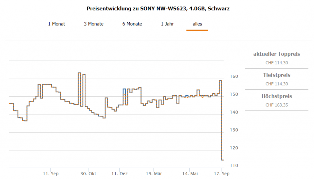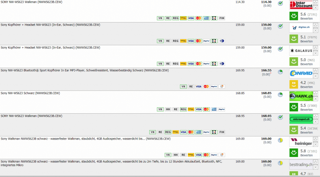 Bei Interdiscount gibt’s den SONY NW-WS623 Walkman für CHF 114.30 Mit dem Gutscheincode HFWID10 gibt’s nochmals 10.- zusätzlichen Rabatt, womit wir bei CHF 104.30 ankommen. Zweitbester Preis in der Schweiz bietet digitec mit CHF 159.- Bestpreis lag bei CHF 136.-