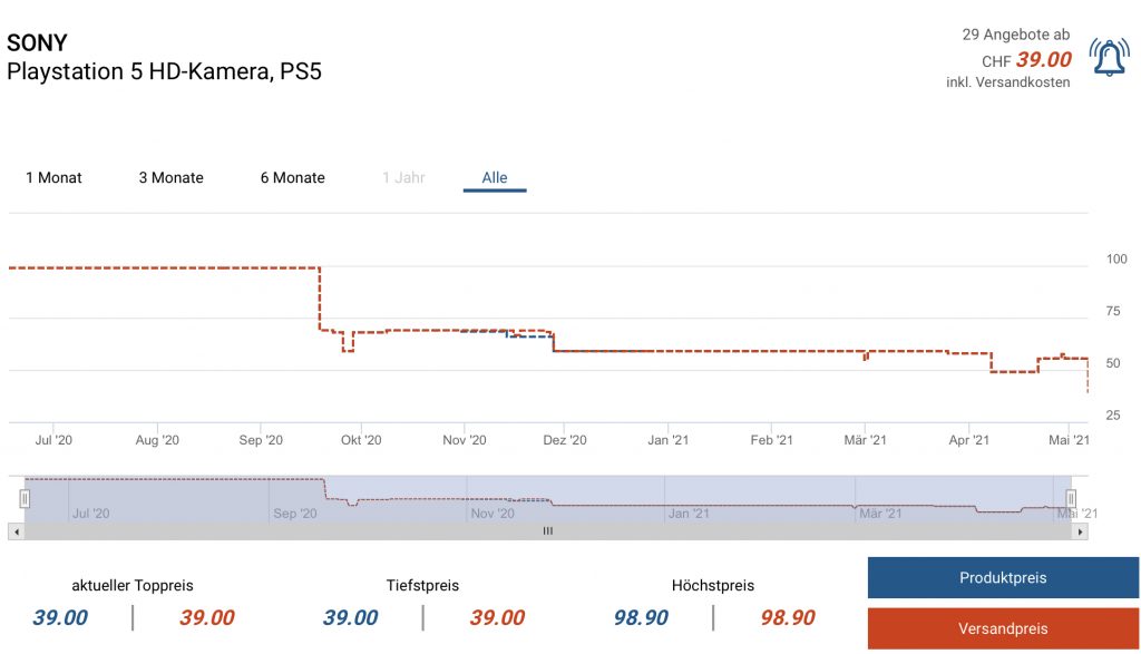 Bei MediaMarkt gibt es aktuell die SONY Playstation 5 HD-Kamera für 39.- CHF. Zweitbester Preis gemäss toppreise sind 55.45 CHF.