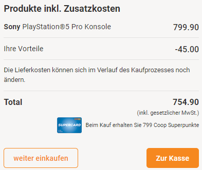 Die Sony PlayStation 5 Pro Konsole könnt ihr bei Fust zum neuen Bestpreis von 754.90 Franken vorbestellen. Einfach Rabattcode anwenden und den Bon in der Supercard-App aktivieren. Der Vergleichspreis liegt bei 799.- Franken.
