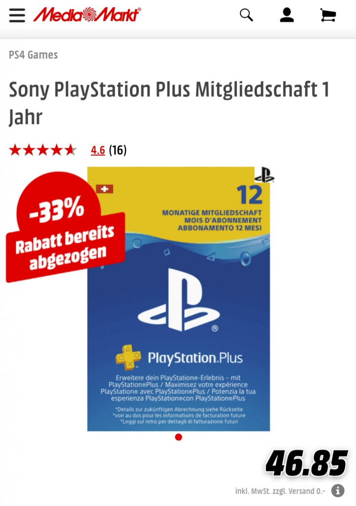 Bei Media Markt gibt es momentan die 1 Jahr PS Plus Mitgliedschaft reduziert.