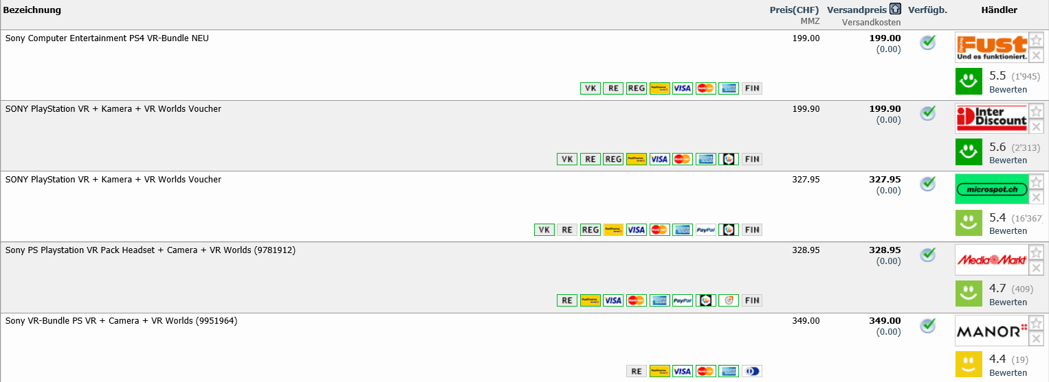Bei Fust & Interdiscount gibt es das SONY Playstation VR Starter Pack inkl. Kamera + VR Worlds für 199.- bzw. 199.90 CHF.