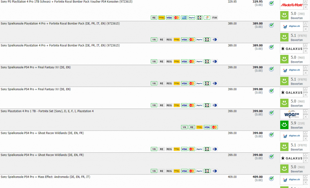Die PS4 Pro 1TB gibt’s momentan ab CHF 370.- wobei der Bestpreis bei CHF 299.- am letzten Black Friday lag. Damit handelt es sich bei diesem Angebot wirklich um einen Hammer-Deal, kostet doch das Spiel Fortnite nur 30.-, wenn man den Bestpreis der PS4 heranzieht.