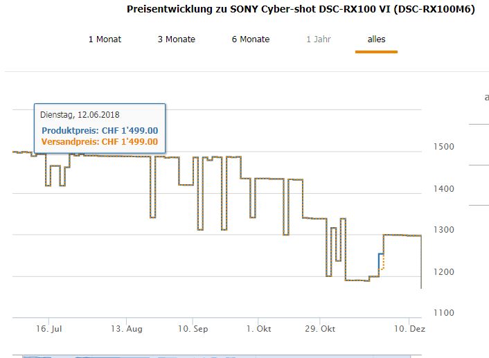 Zugegeben, günstig ist sie nach wie vor nicht. Aber falls jemand vor Weihnachten damit geliebäugelt hat: Die Sony RX100 VI gibt’s momentan bei Brack für 1’169, zusammen mit dem Gutschein aus dem Brack-Game kommt man so auf den Endpreis von 1’159.-. Der günstigste Preis bislang war vor einem Monat 1’188 - wir haben damit einen neuen Tiefstpreis.