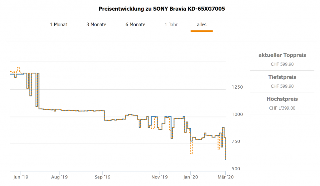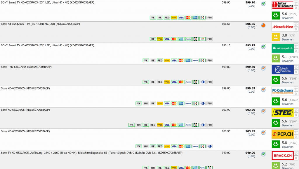 Bei Interdiscount gibt’s gerade den SONY Smart TV KD-65XG7005 (65″, LED, Ultra HD - 4K) für CHF 599.- Zweitbester Preis beträgt CHF 806.85 Bestpreis war laut toppreise bei CHF 658.75