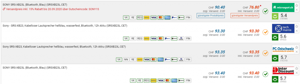 Die SONY SRS-XB23L Bluetooth-Lautsprecher gibt es deshalb zum Bestpreis von CHF 76.80. Der vorherige Bestpreis war CHF 88.40. Der zweitbeste Preis beträgt CHF 93.30.