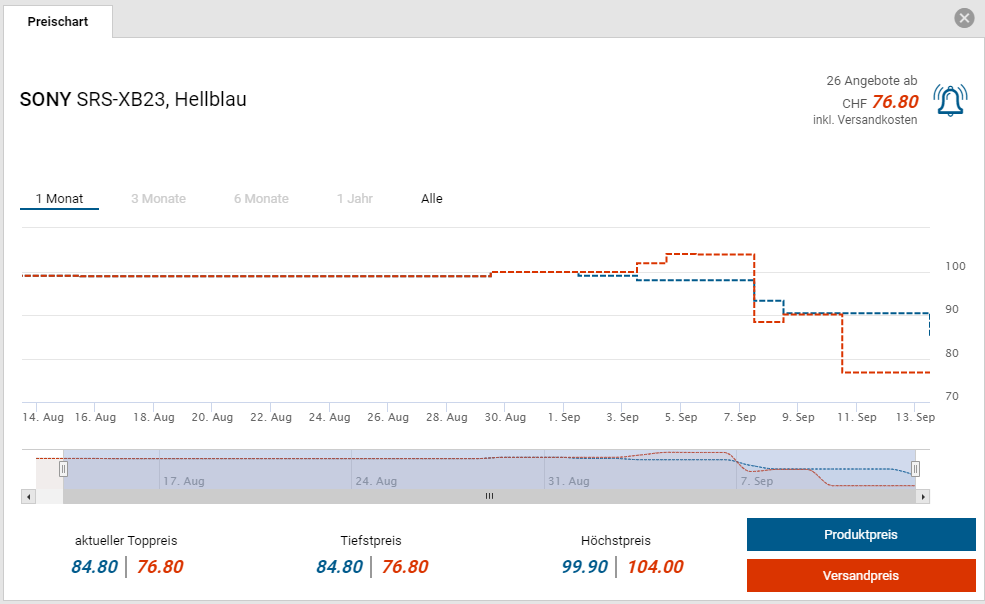 Die SONY SRS-XB23L Bluetooth-Lautsprecher gibt es deshalb zum Bestpreis von CHF 76.80. Der vorherige Bestpreis war CHF 88.40. Der zweitbeste Preis beträgt CHF 93.30.