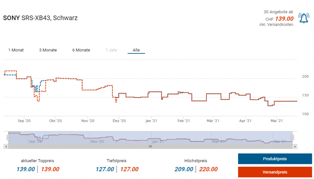 Bei Mediamarkt gibts derzeit im Rahmen der „unwiderstehlichen Sony Angebote“ die mobilen Lautsprecher SRS-XB43 zum Bestpreis von 127 Franken. Laut toppreise gabs diesen Preis zuletzt vor etwa einem Monat, beim zweitgünstigsten Anbieter kosten sie 139 Franken.