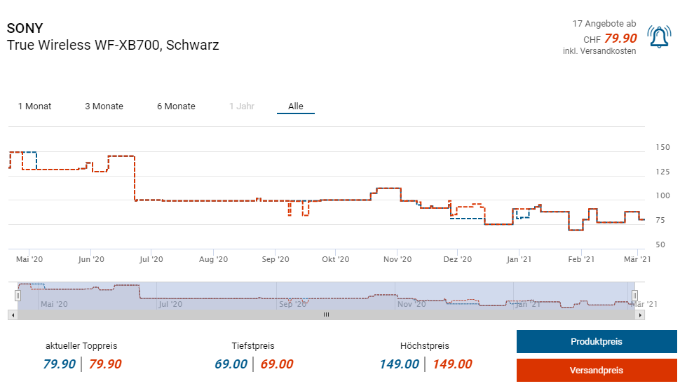 Bei Amazon gibts derzeit die WF-XB700 TWS-Kopfhörer von Sony zum Bestpreis von 69 Franken. Laut toppreise soll der Vergleichspreis bei knapp 80 Franken liegen.