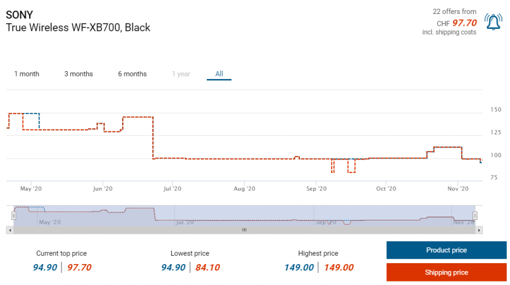 Bei Amazon Italien gibts derzeit die kabellosen Kopfhörer WF-XB700 von Sony zum Aktionspreis von knapp 72 Franken. Laut toppreise liegt der zweittiefste Preis derzeit bei CHF 97.70.