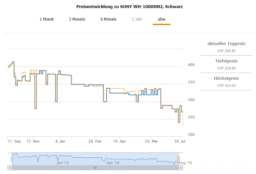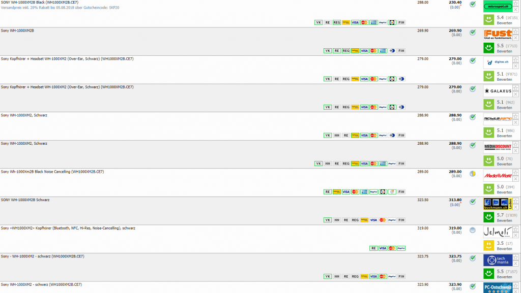 Bei microspot Interdiscount gibt’s gerade den SONY WH-1000XM2 Over Ear Kopfhörer zum neuen Best Price von für CHF 219.90, wenn man den Gutscheincode HFWMSP20 eingibt. Der zweitbeste Preis in der Schweiz liegt bei CHF 279.- In der 1. August-Aktion von Interdiscount gab es den Kopfhörer schon mal für CHF 229.90 (nach Abzug des 10.- Gutscheincodes). Im toppreise Preisverlauf sehe ich einen Preis von CHF 214.40 drin, also ist der neue Preis nicht ganz ein Bestpreis. Trotzdem für diesen Kopfhörer ein super Deal.