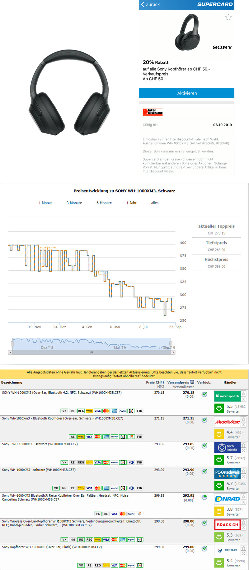 Momentan bekommt man bei Interdiscount den Sony WH-1000XM3 Kopfhörer zum Bestpreis von CHF 239.95 wenn man vorgängig in der Supercard-App die 20% Rabatt-Aktion aktiviert und den Kopfhörer vor Ort in einer Filiale kauft (im Onlineshop wird der Rabatt NICHT abgezogen).