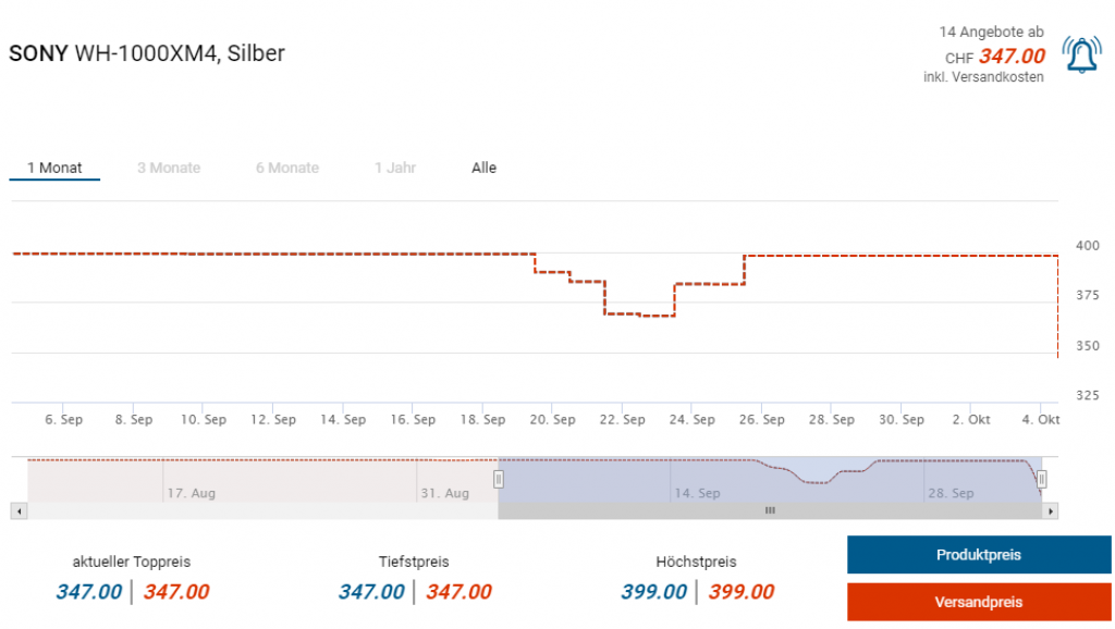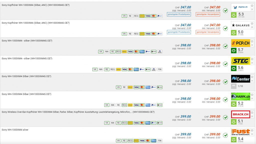 Bei Amazon gibt’s die Sony WH-1000XM4 in der Farbe silber gerade zum offenbar neuen Bestpreis von CHF 312.55. In der Schweiz kostet die Farbe silber ab CHF 347.- Die Farbe schwarz ab CHF 398.-