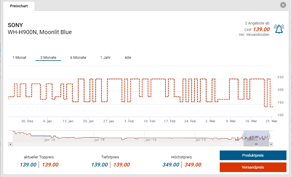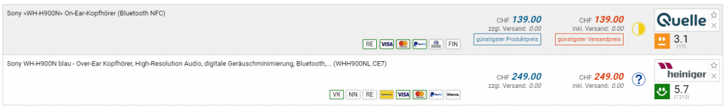 Bei Quelle gibt es die SONY WH-H900N Kopfhörer für den Bestpreis von CHF 139.-. Der Preis war letzte Woche am Freitag schon einmal so tief. Das zweitbeste Angebot beträgt CHF 249.-.