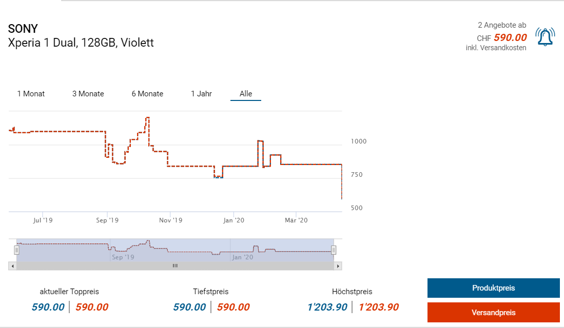 Bei digitec kriegt ihr gerade das letztjährige Sony Xperia 1 in der Farbe Violett zu einem einigermassen anständigen Preis. Leider ist dieses Modell bei keinem anderen Händler geführt, deswegen gebe ich den aktuellen Tiefstpreis der schwarzen Variante als Zweitpreis an.