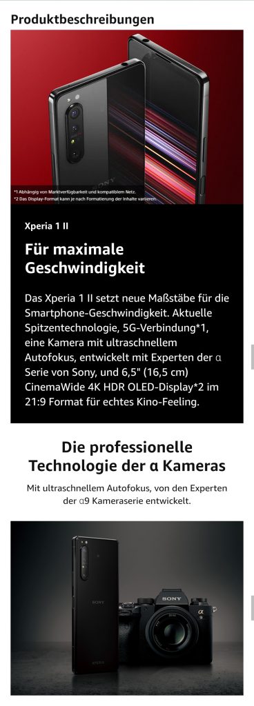 - Mit keiner anderen bisherigen Smartphone-Kamera gelingen Aufnahmen wie beim Xperia 1 II. Sie wurde in Kooperation mit den Experten der neuesten Kameras der Alpha 9-Serie entwickelt und bietet einen branchenführenden Autofokus.