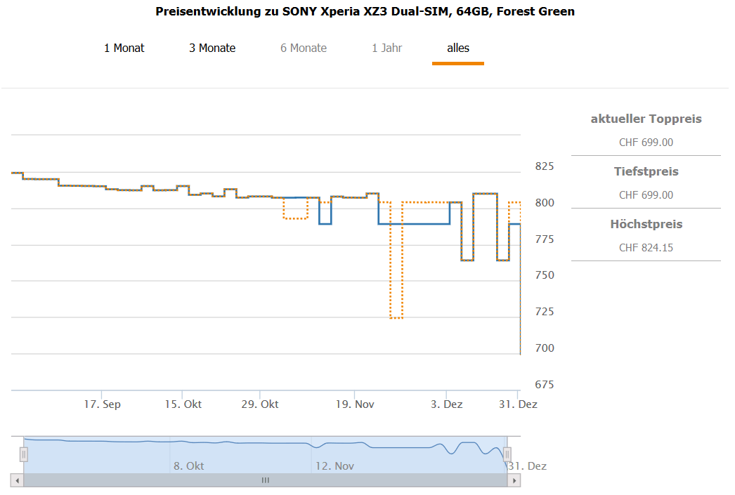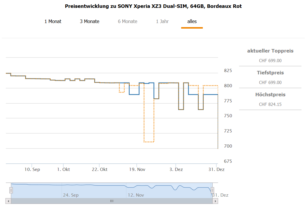 Gemäss toppreise war der bestprice über alle Farben bislang bei 706.25 CHF, der zweitbeste Preis liegt aktuell bei 754.70 CHF.