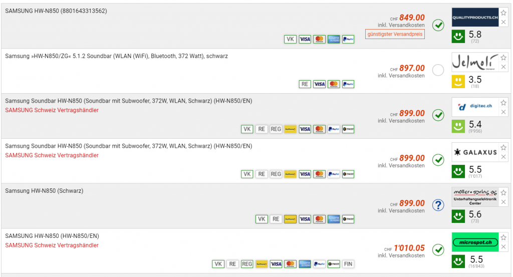 Bei DayDeal gibt’s im Deal of the Week die Soundbar + Subwoofer Samsung HW-N850 für CHF 499.- Bestpreis laut toppreise war bei CHF 764.15 Derzeit zweitbester Preis beträgt CHF 849.-