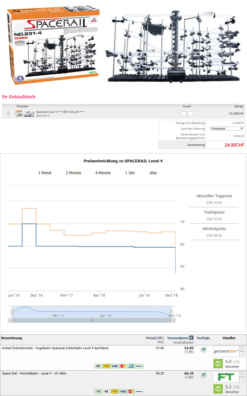Heute gibt es bei Gudi im Tagesdeal die Spacerail Level 4 Kugelbahn zum Bestpreis von CHF 24.90 (das Produkt selber kostet CHF 15.- und leider fallen happige CHF 9.90 Portokosten an). Ab einer Bestellung von 2 Stück gibt es noch 1 gratis dazu, was den Preis pro Bahn natürlich faktisch nochmals senkt. Vielleicht ja ein passendes Ostergeschenk in der Familie oder Verwandtschaft 😉
