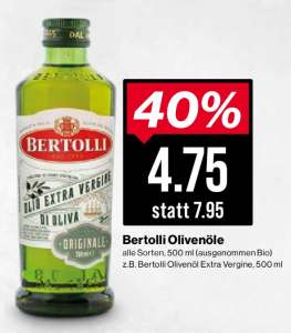 Zum Beispiel könnt ihr 500 ml Bertolli Robusto extra Vergine Olivenöl für CHF 4.75 statt für CHF 7.95