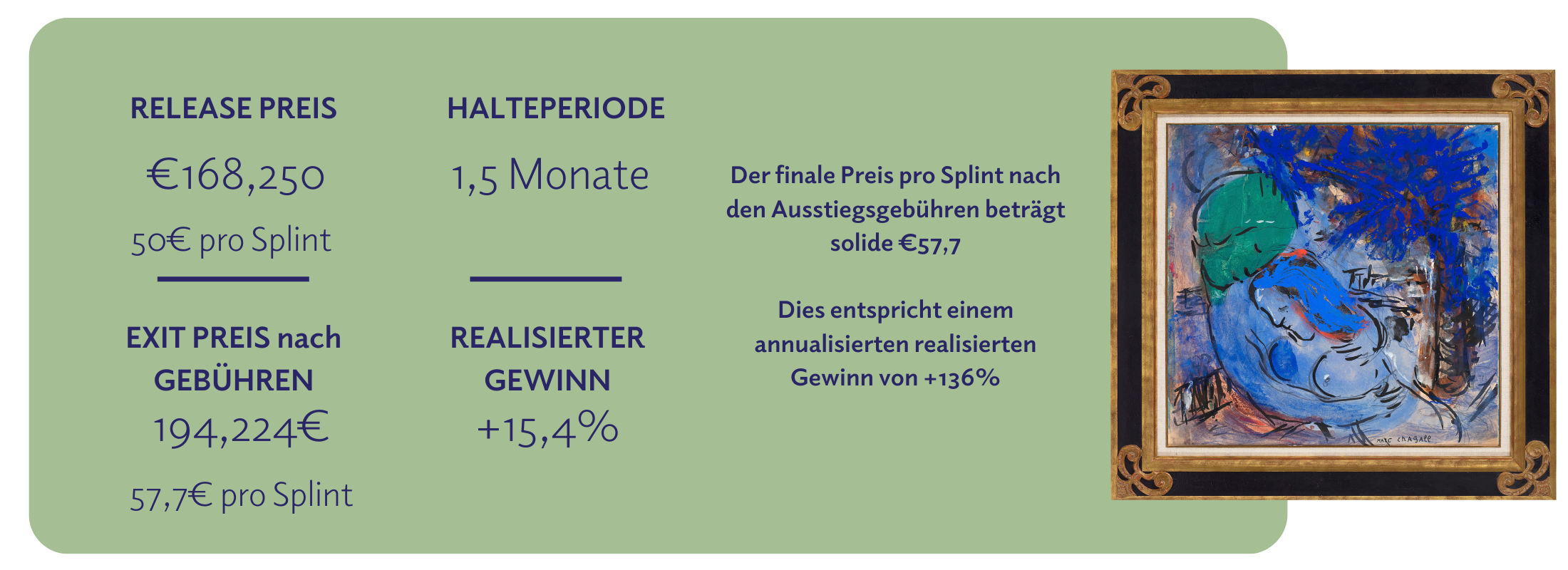 Erst letzte Woche brachte Marc Chagalls „Der Schlaf der Liebe“ (Le sommeil amoureux), 1956-1957, aussergewöhnliche Renditen und erreichte das optimistische Szenario des zweiten Jahres schon nach nur 1,5 Monaten. Investoren, die bei dieser Gelegenheit mit Splint Invest dabei waren, haben einen bemerkenswerten Gewinn von 15,4% nach Abzug aller Gebühren erzielt;