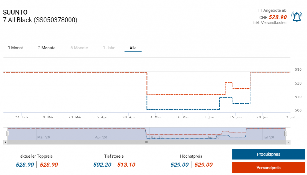 Bei Mediamarkt gibts derzeit die Sport-Smartwatch Suunto 7 zum Aktionspreis von 449 Franken. Laut toppreise beträgt der zweitbeste Preis derzeit knapp 529 Franken, bei Amazon gibts allenfalls eine andere Farbvariante für 463 Franken. Die Suunto 9 dagegen schein wesentlich günstiger zu sein, inwiefern sich die Modelle unterscheiden kann ich euch mangelnder Erfahrung aber nicht sagen.